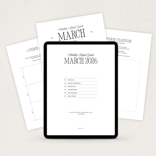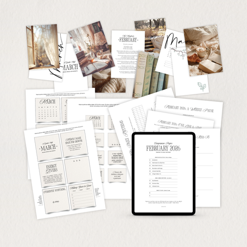 A guided monthly experience that includes reflection prompts, intentional planning pages, dashboards, sticky notes and ritual-inspired tools to help you reset each month.