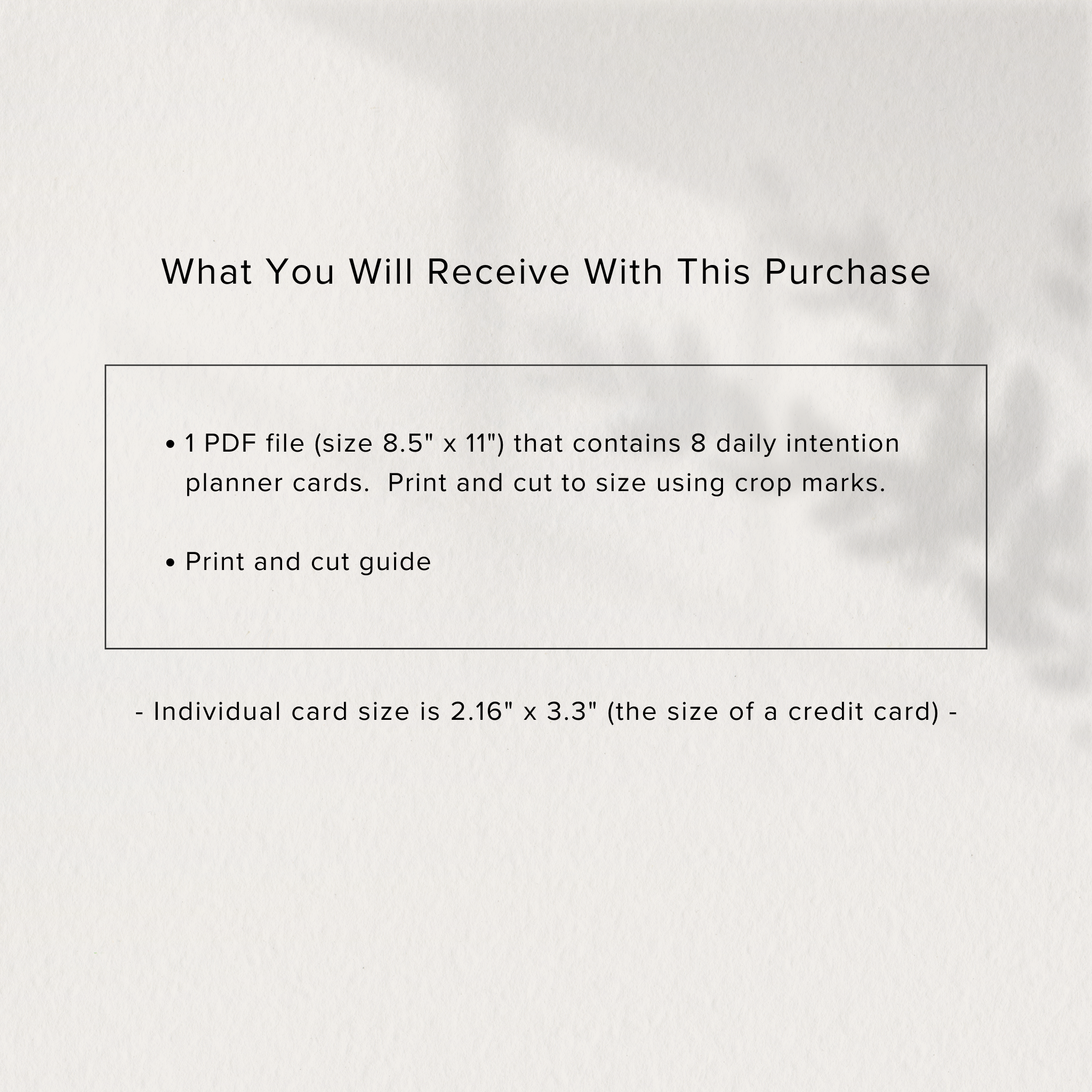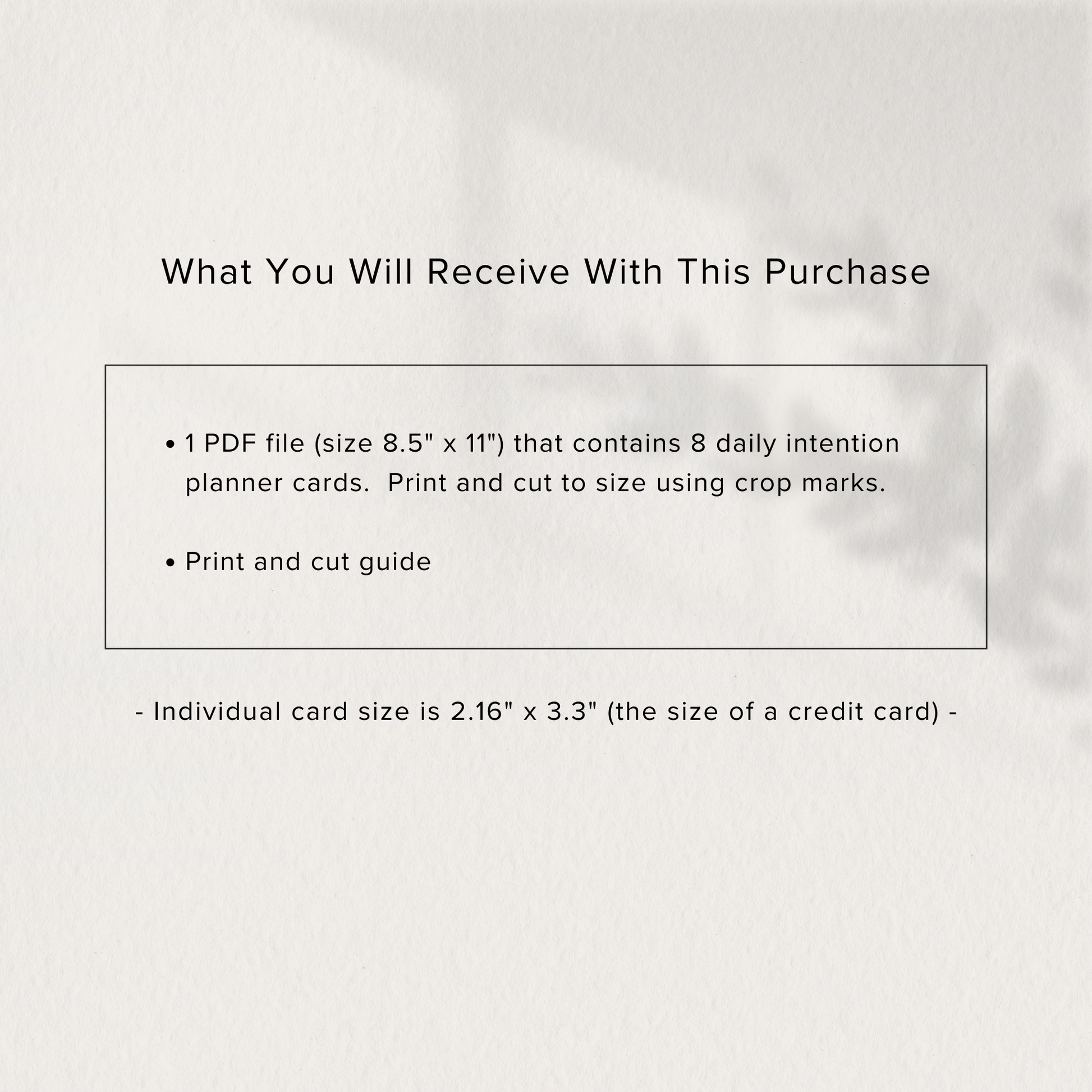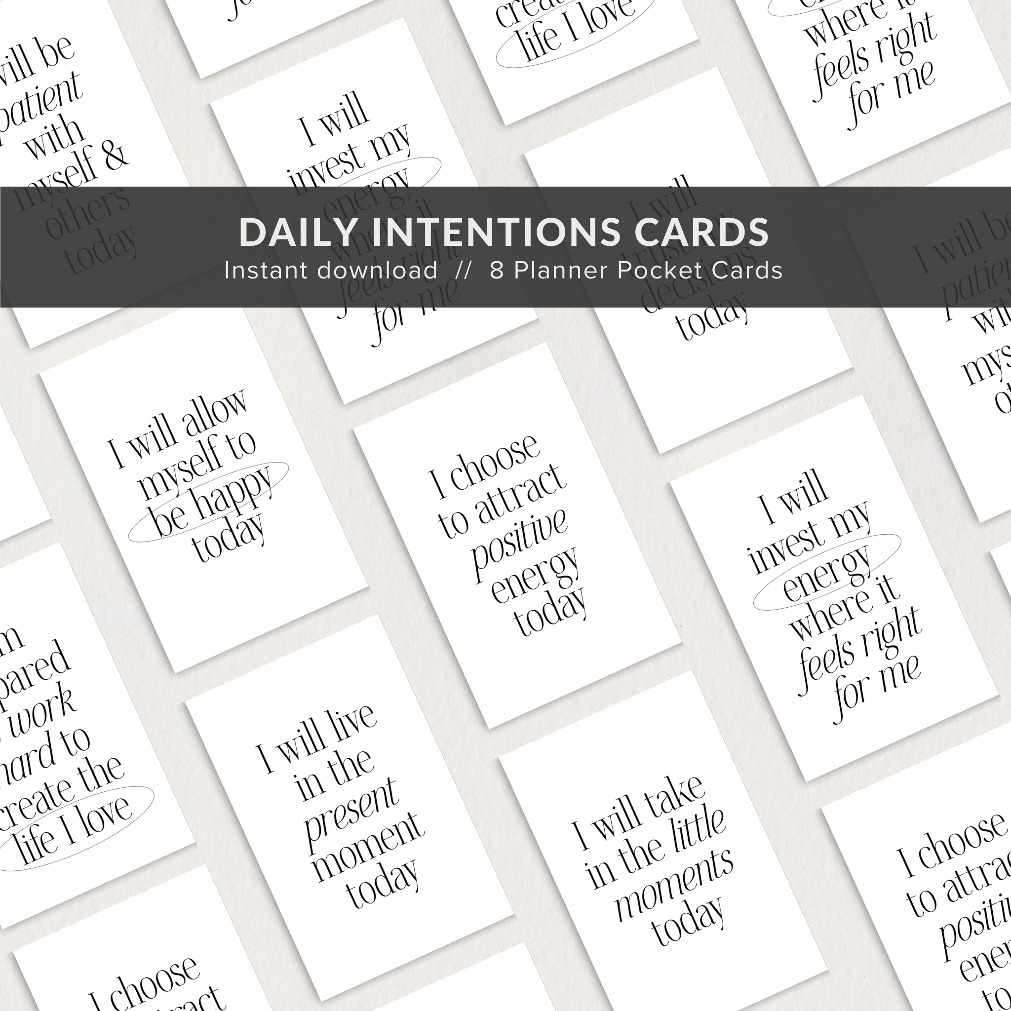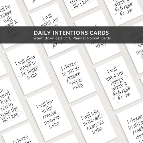Printable, modern planner pocket cards to inspire you and help you set your daily intention! Instantly and easily download, print and cut to size. Insert into business card/credit card pockets or attached to your planner pages and dashboard as you wish!