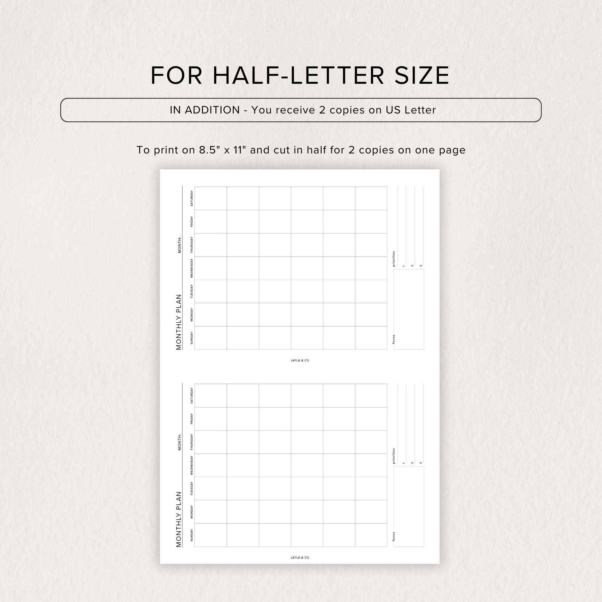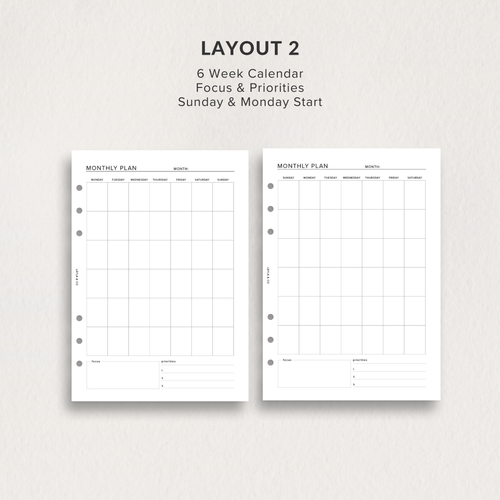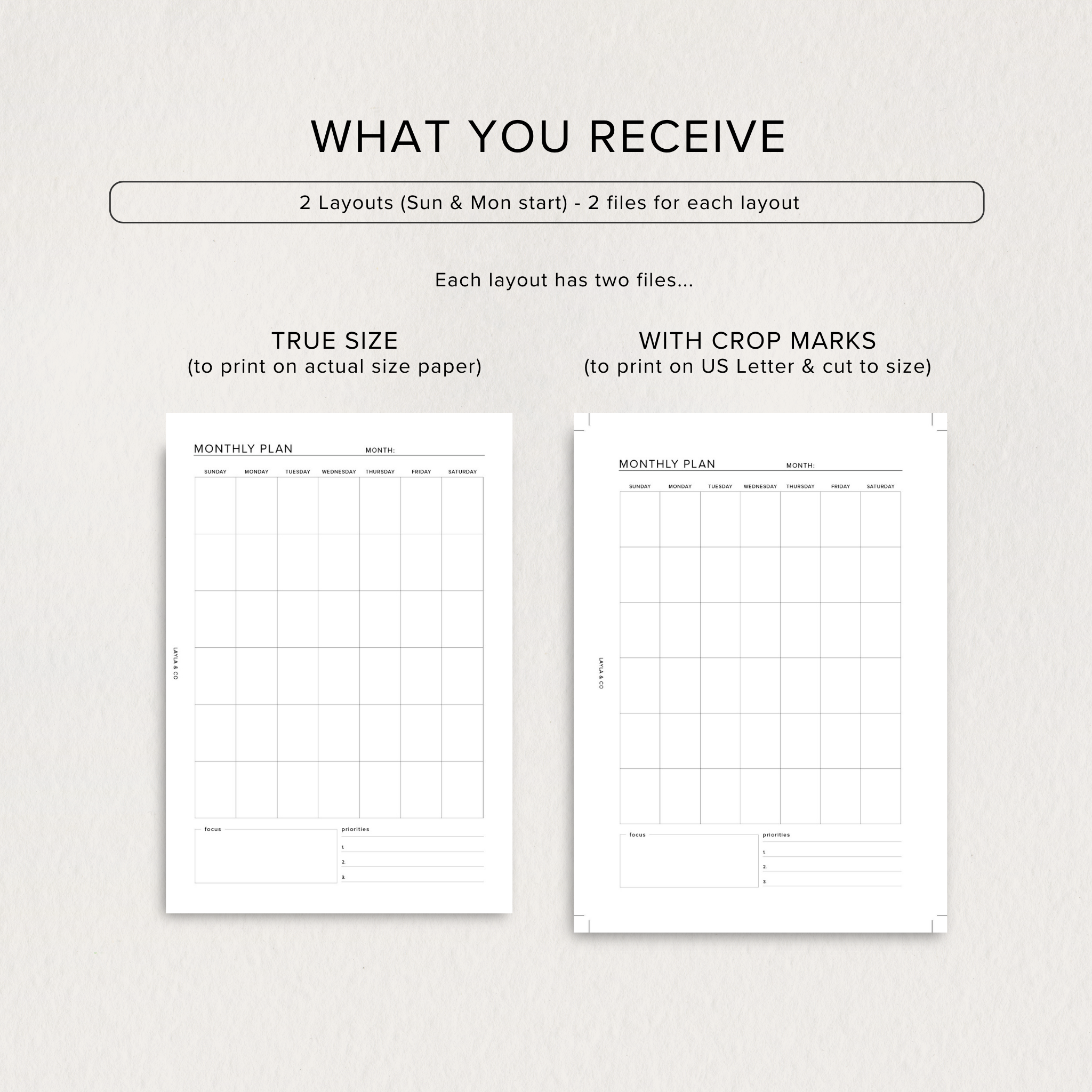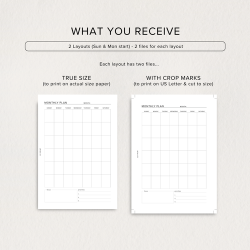 When you select your size, you’ll receive 2 monthly plan layouts (in Sun and Mon start), each with multiple print-ready options for ease and flexibility.