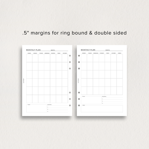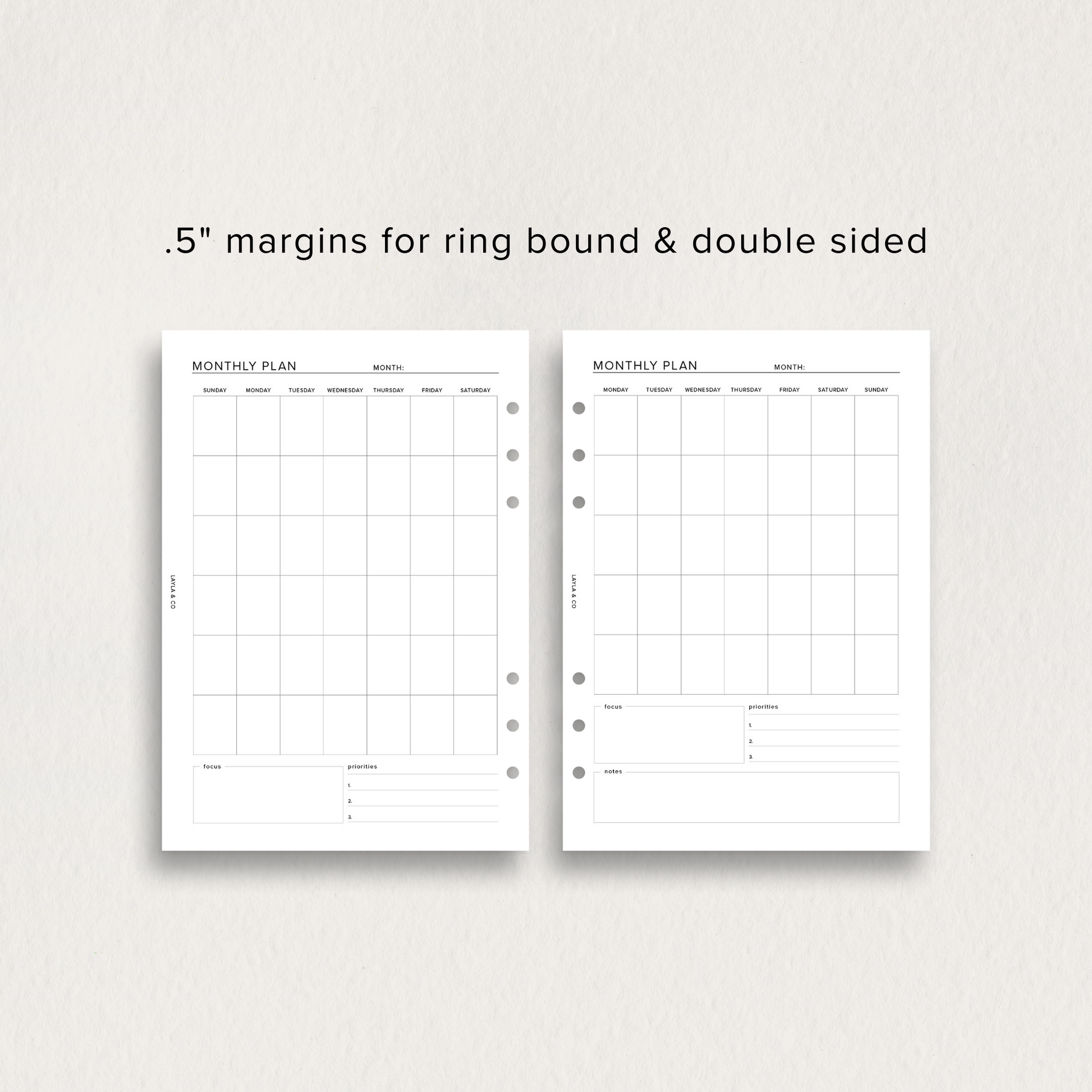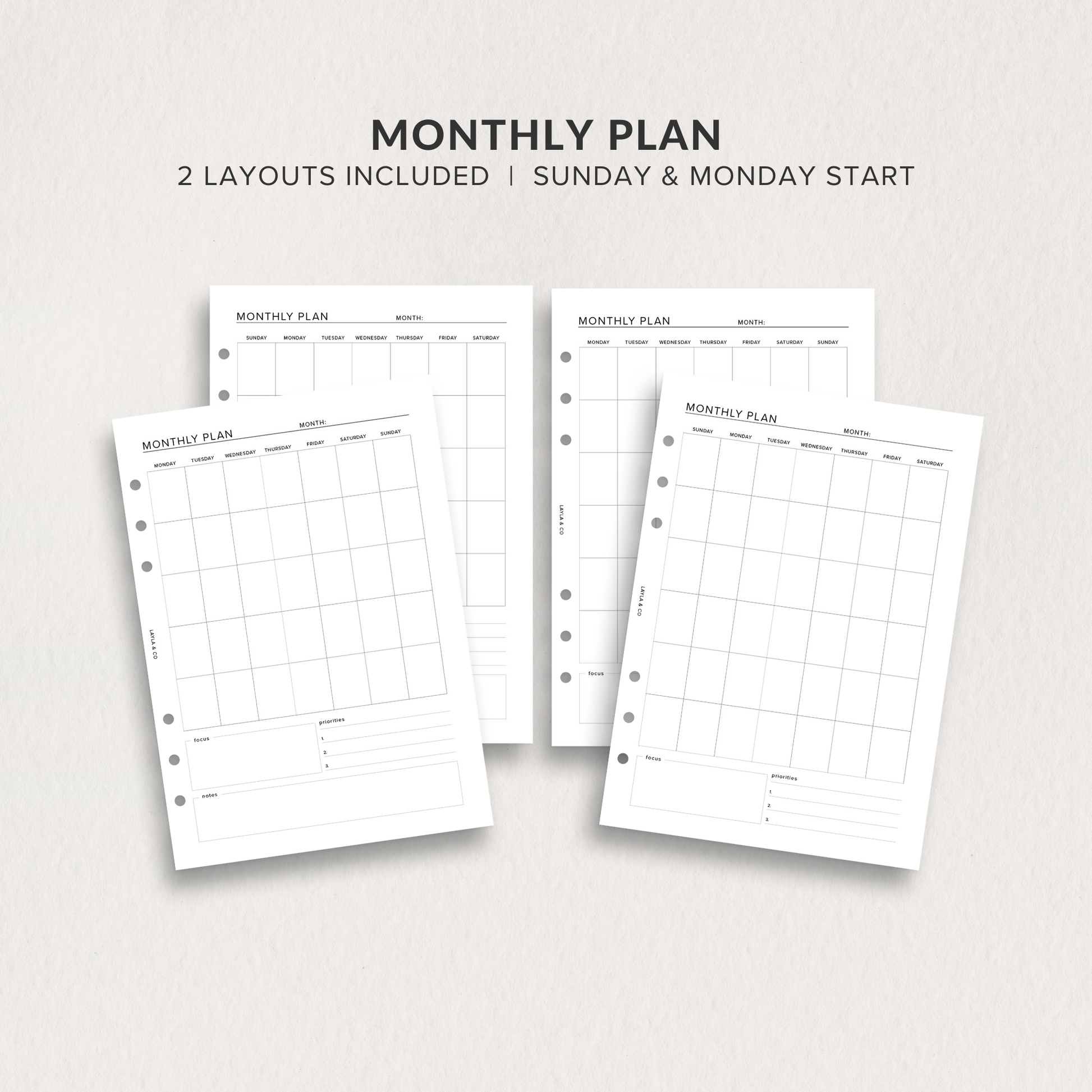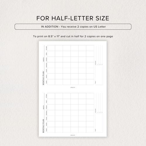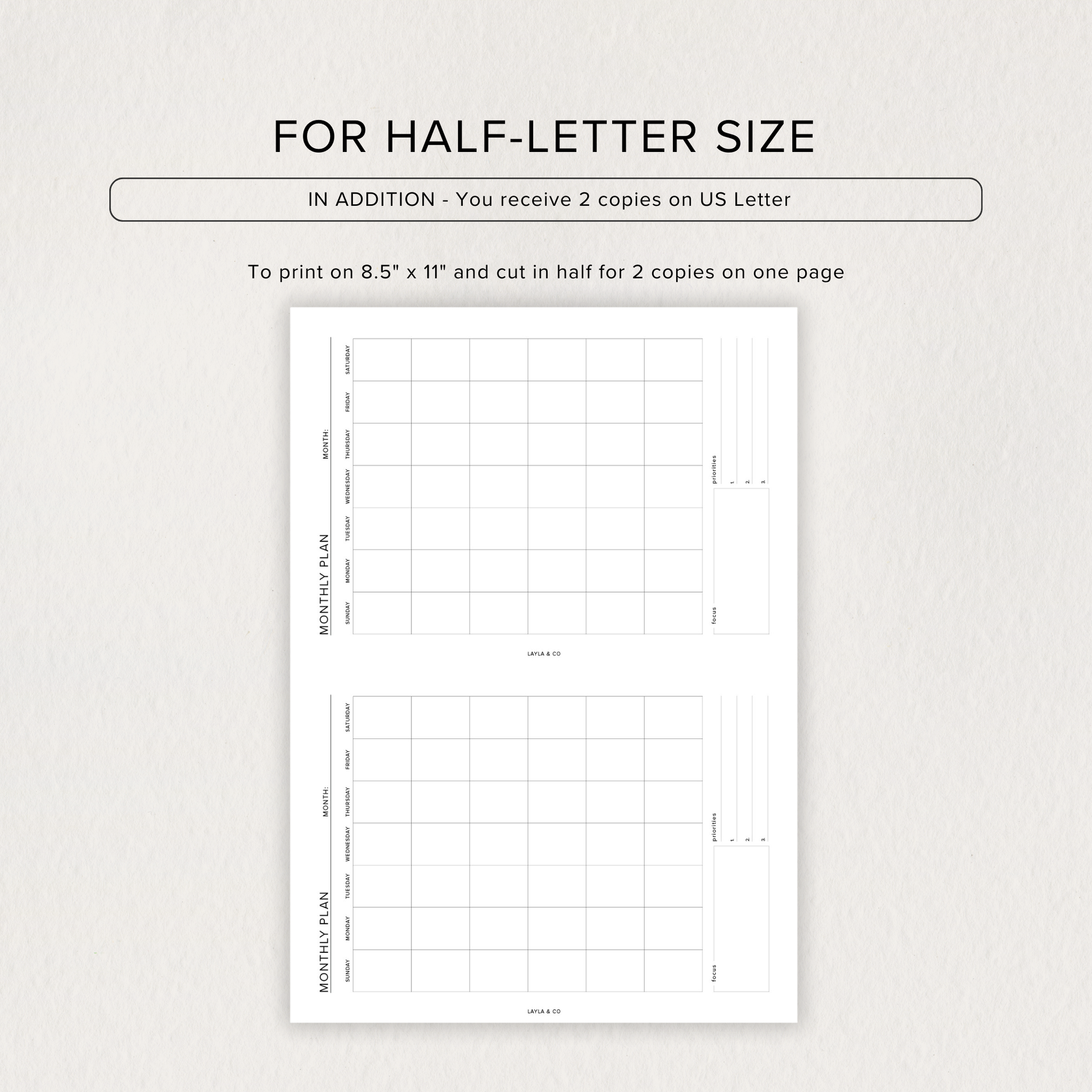 When you select your size, you’ll receive 2 monthly plan layouts (in Sun and Mon start), each with multiple print-ready options for ease and flexibility.