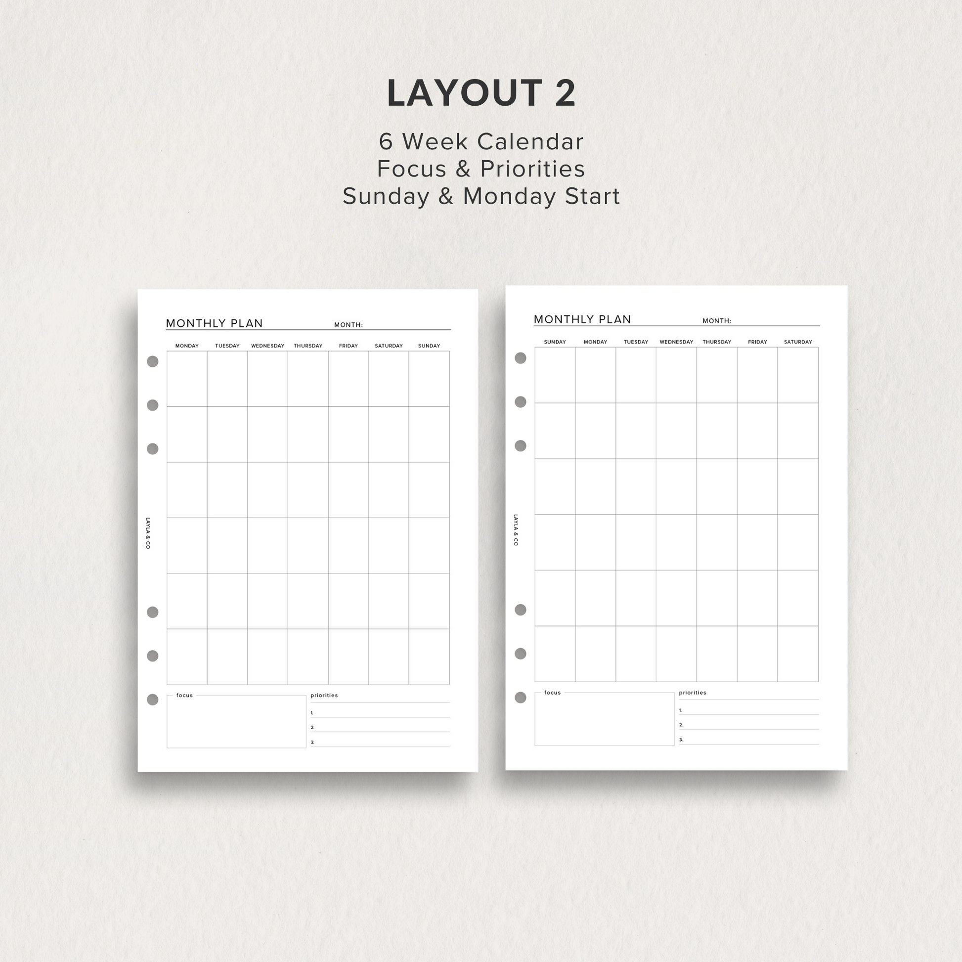Includes both 5-week and 6-week layouts, each available in Monday and Sunday start options, so you can choose the rhythm that fits your life best.