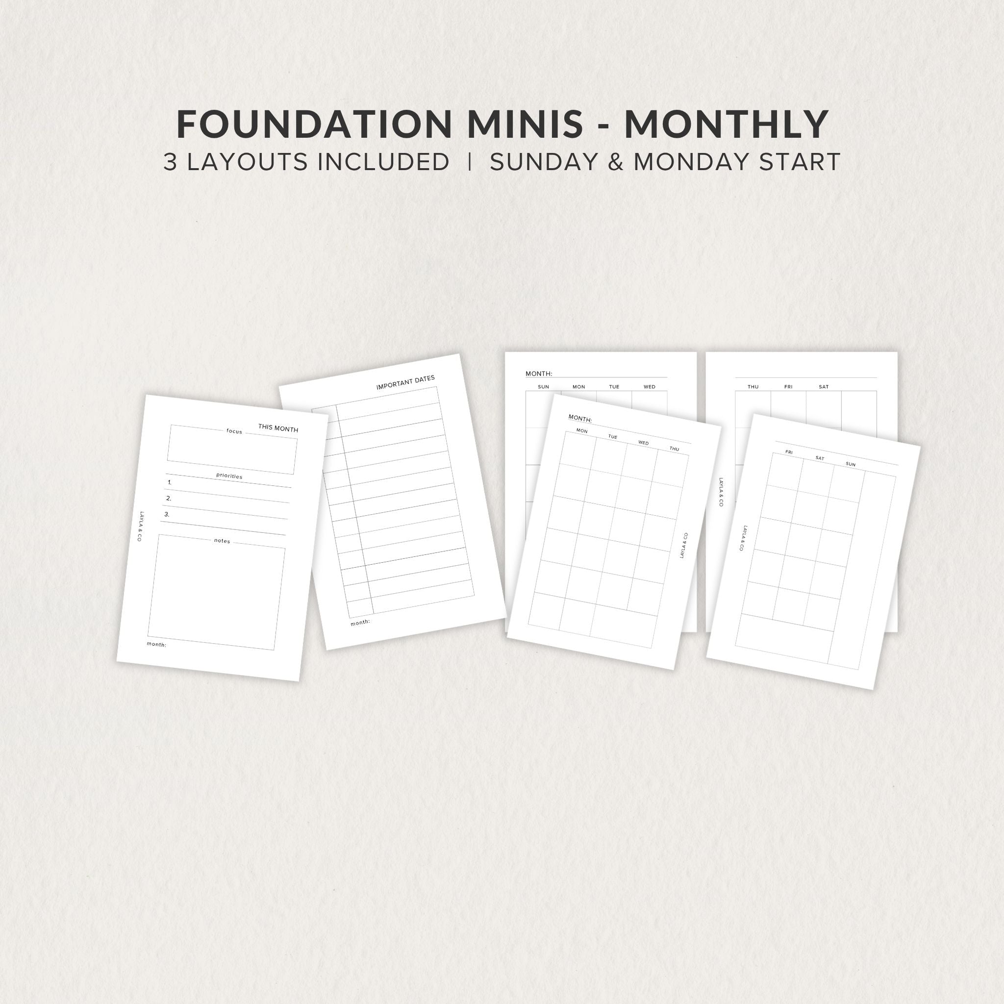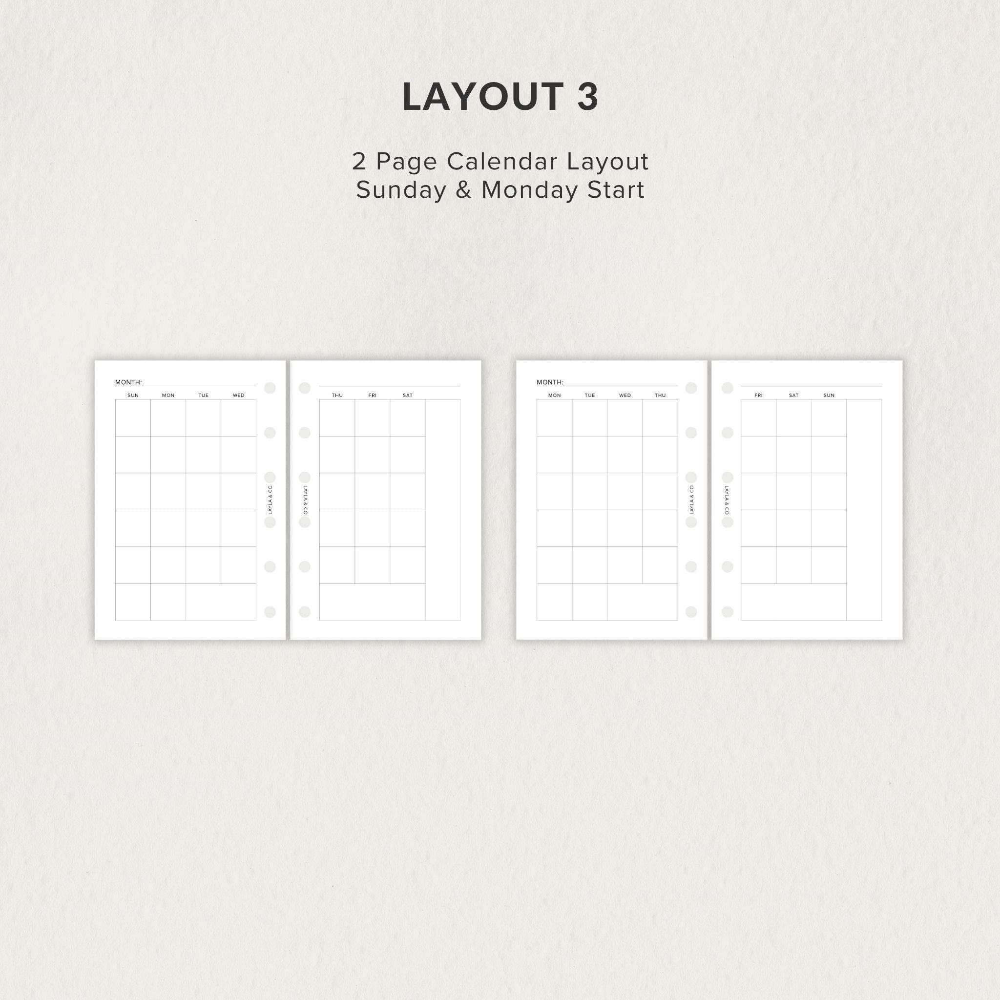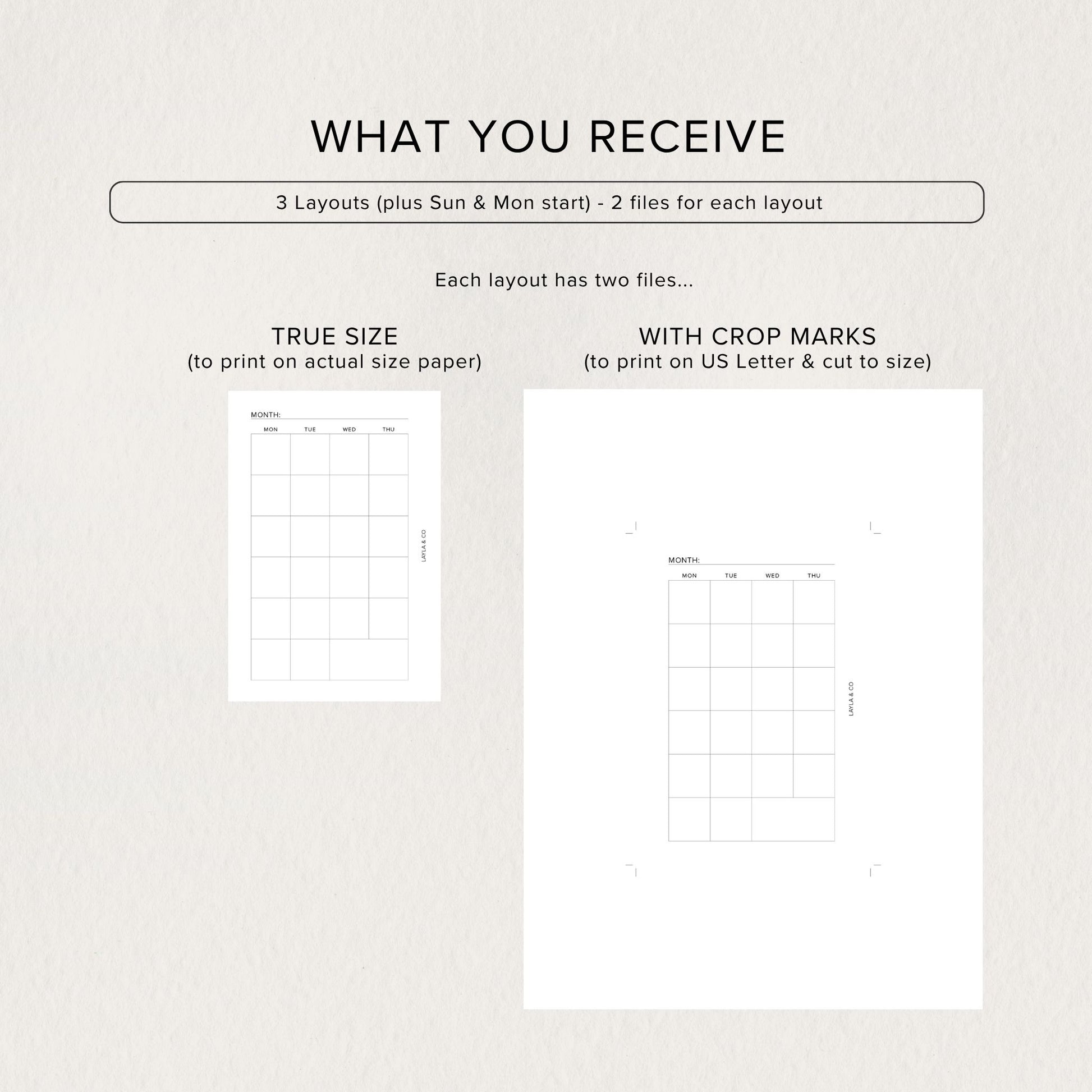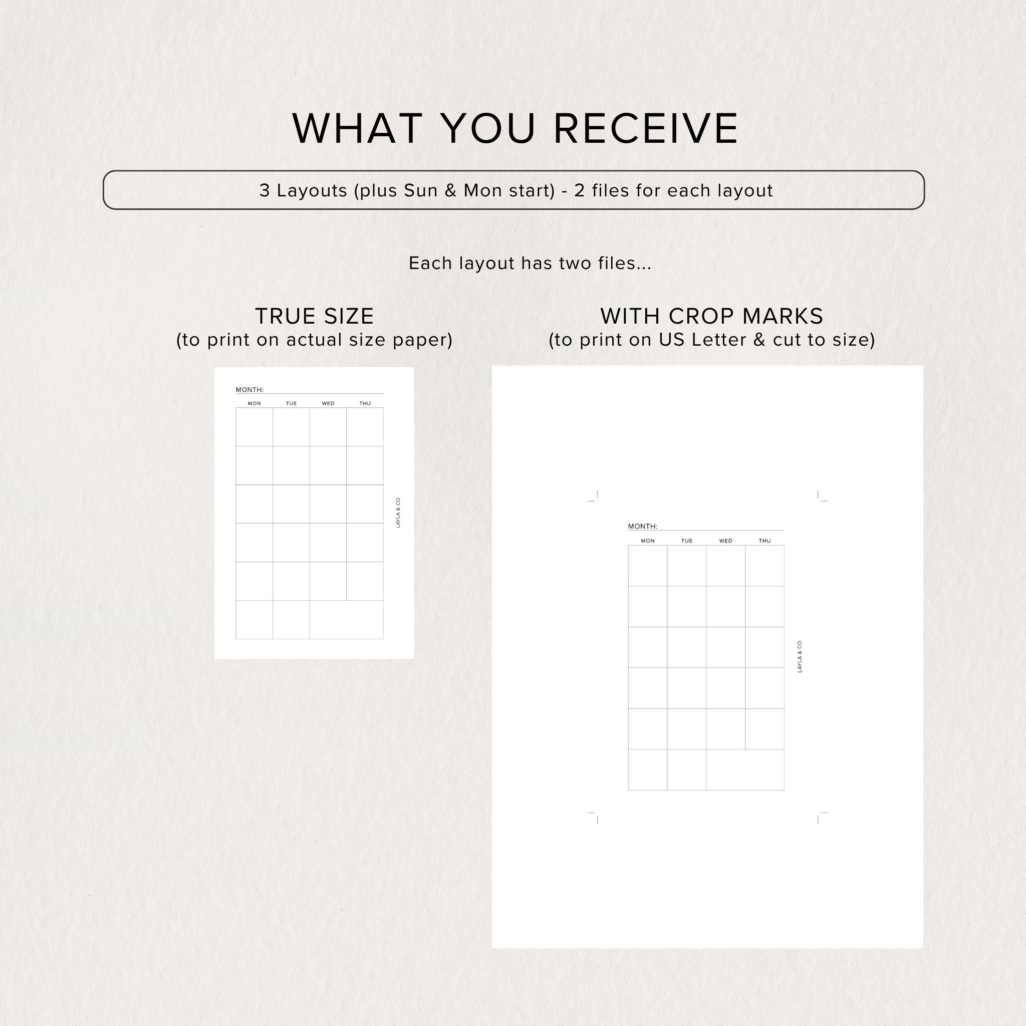 When you select your size, you’ll receive 3 monthly layouts (calendar includes Sun and Mon start), each with multiple print-ready options for ease and flexibility.