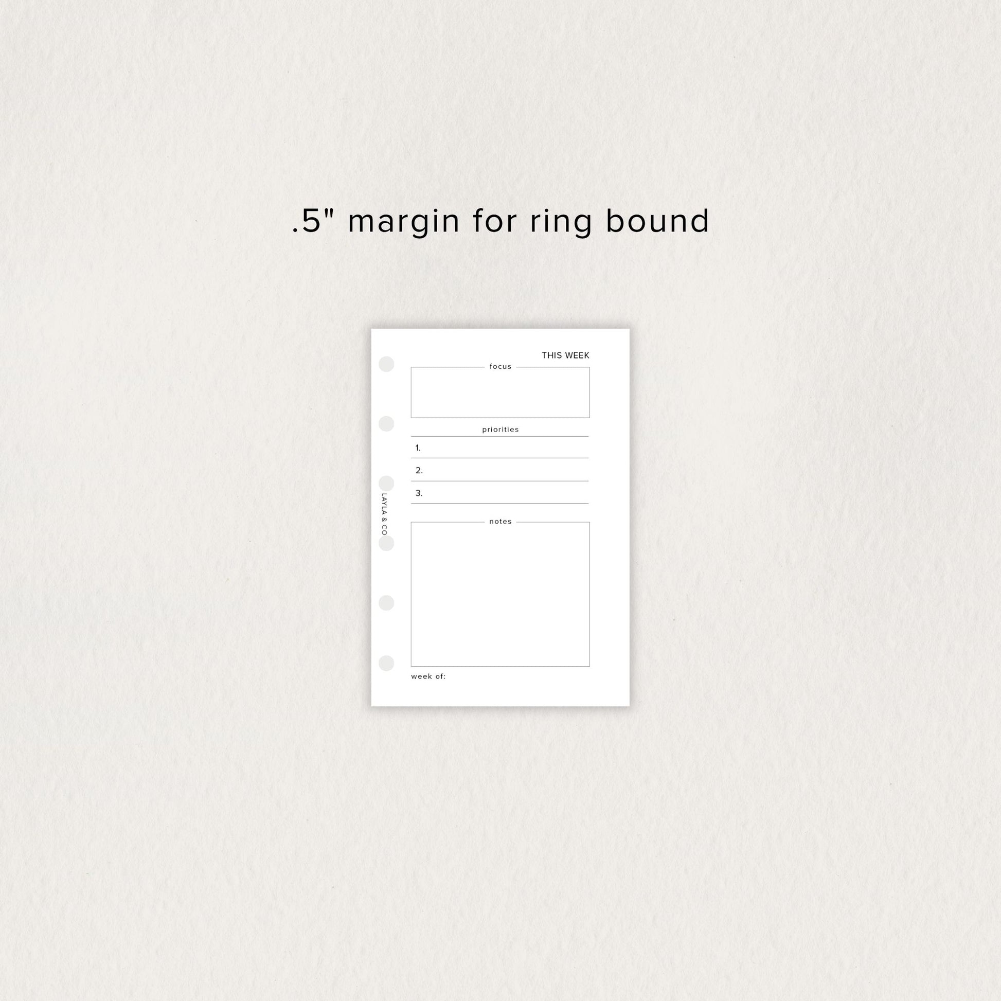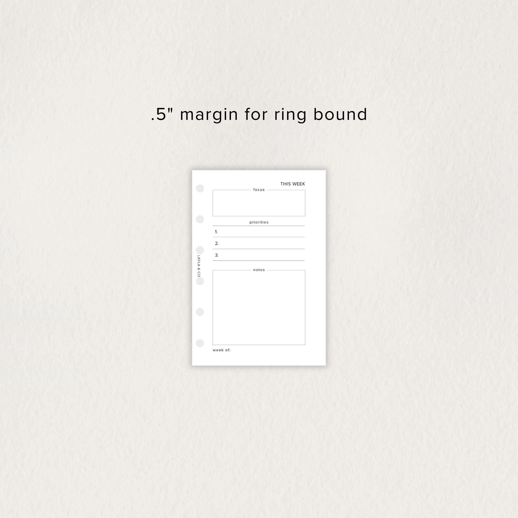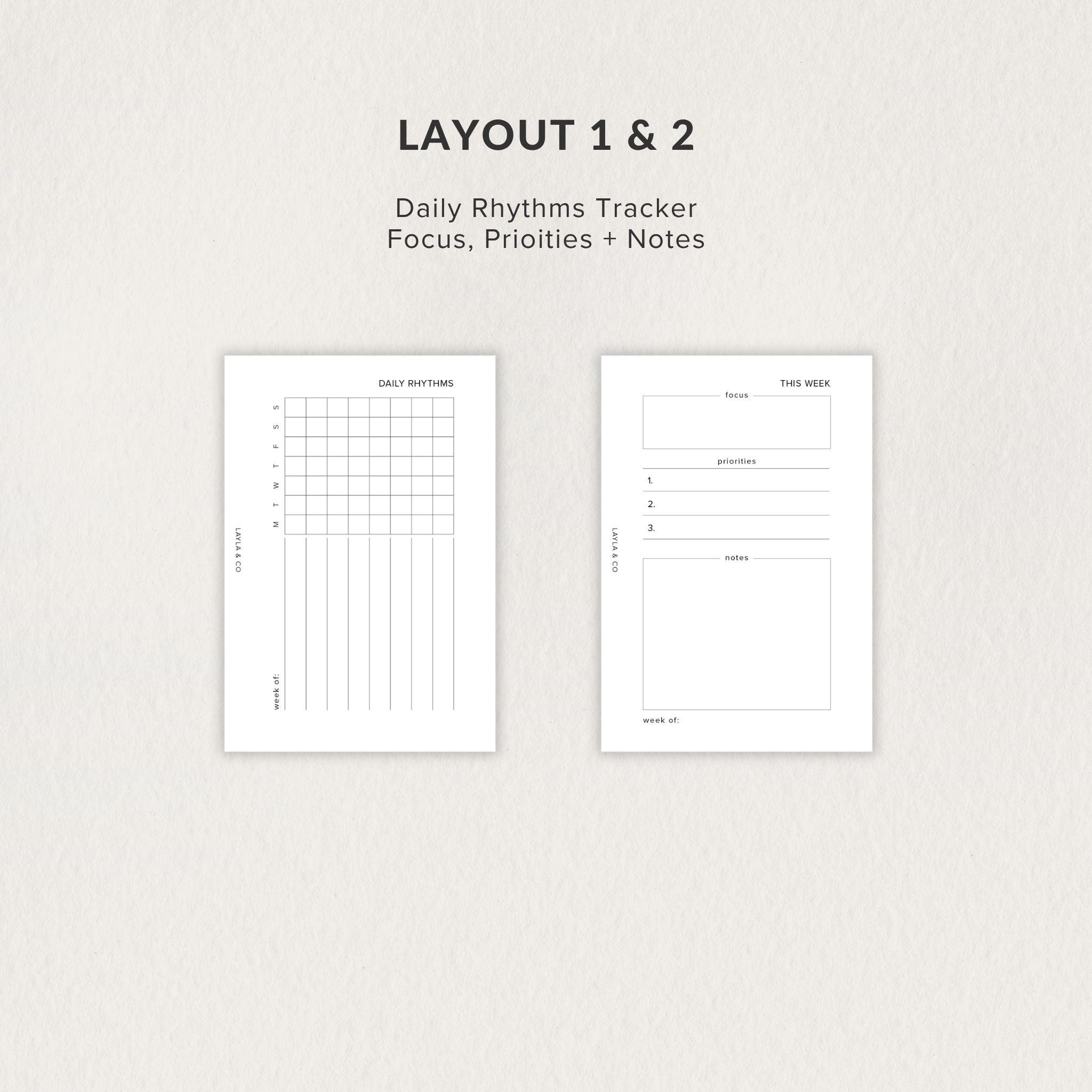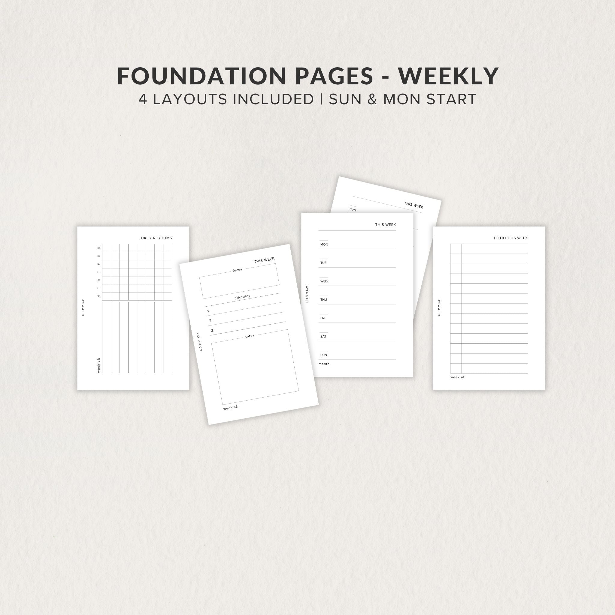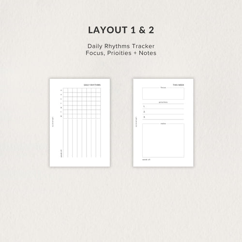 Includes four unique layouts: a 7-day daily rhythm tracker, a focus + priorities + notes page, a 7-day block layout (sun + mon start), and a weekly to-do checklist.