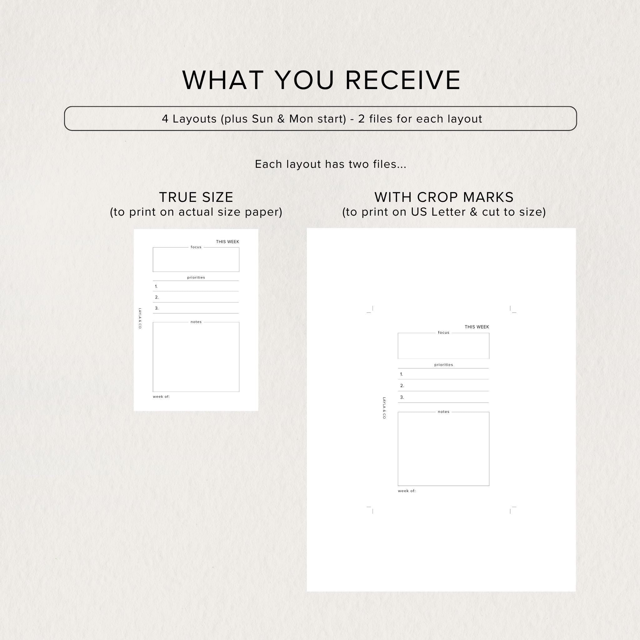 When you select your size, you’ll receive 4 weekly plan layouts (including Sun and Mon start), each with multiple print-ready options for ease and flexibility.