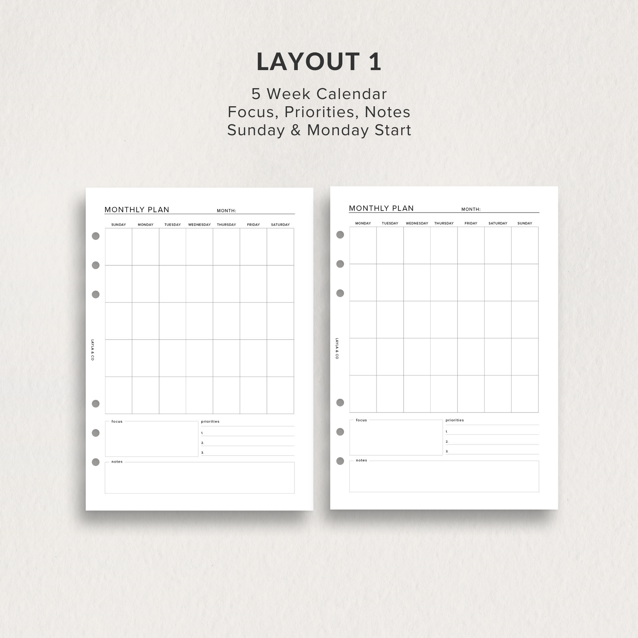 Includes both 5-week and 6-week layouts, each available in Monday and Sunday start options, so you can choose the rhythm that fits your life best.
