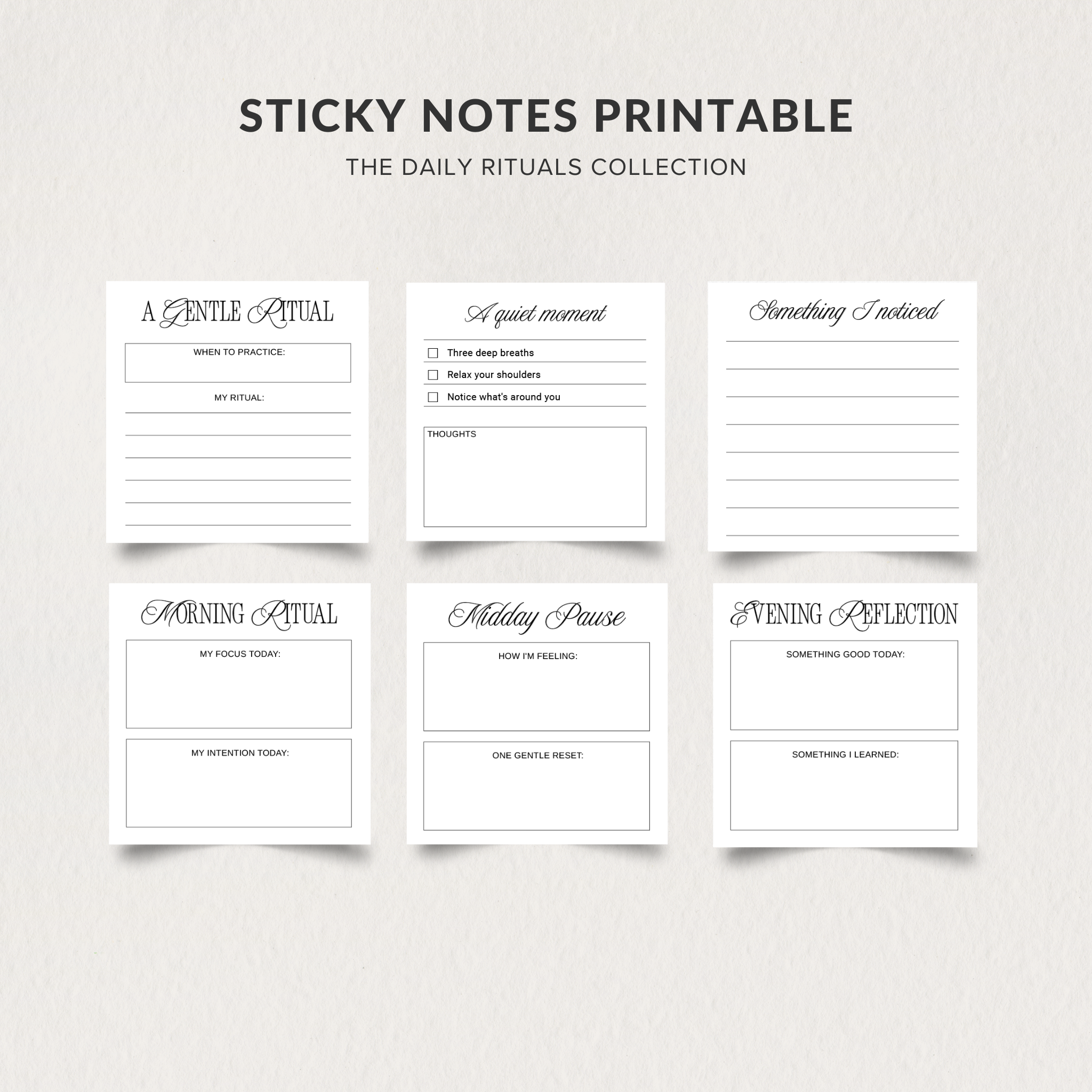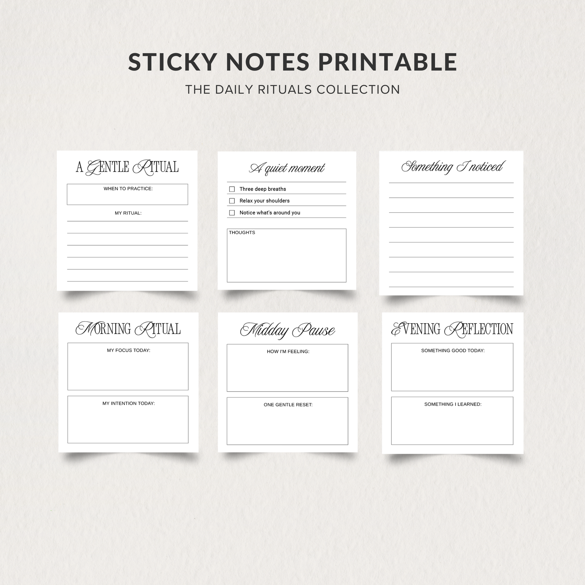 A gentle collection of printable sticky notes designed to support small daily rituals. Use them to set intentions in the morning, pause during the day, and reflect in the evening.
