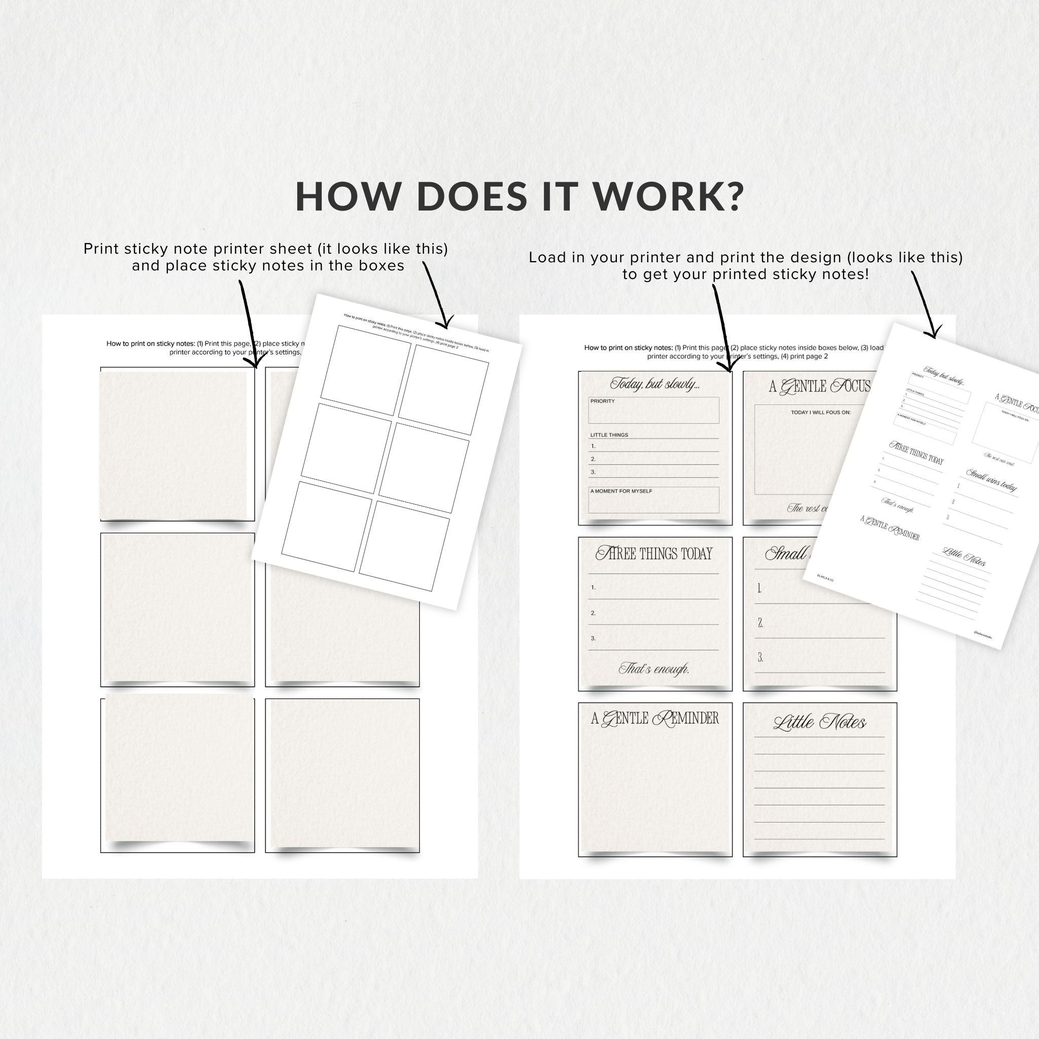 Instantly download the files and print them on any standard 3" × 3" sticky notes using your home printer. Simple to use, flexible, and designed to layer beautifully into your planner, journal, or workspace.