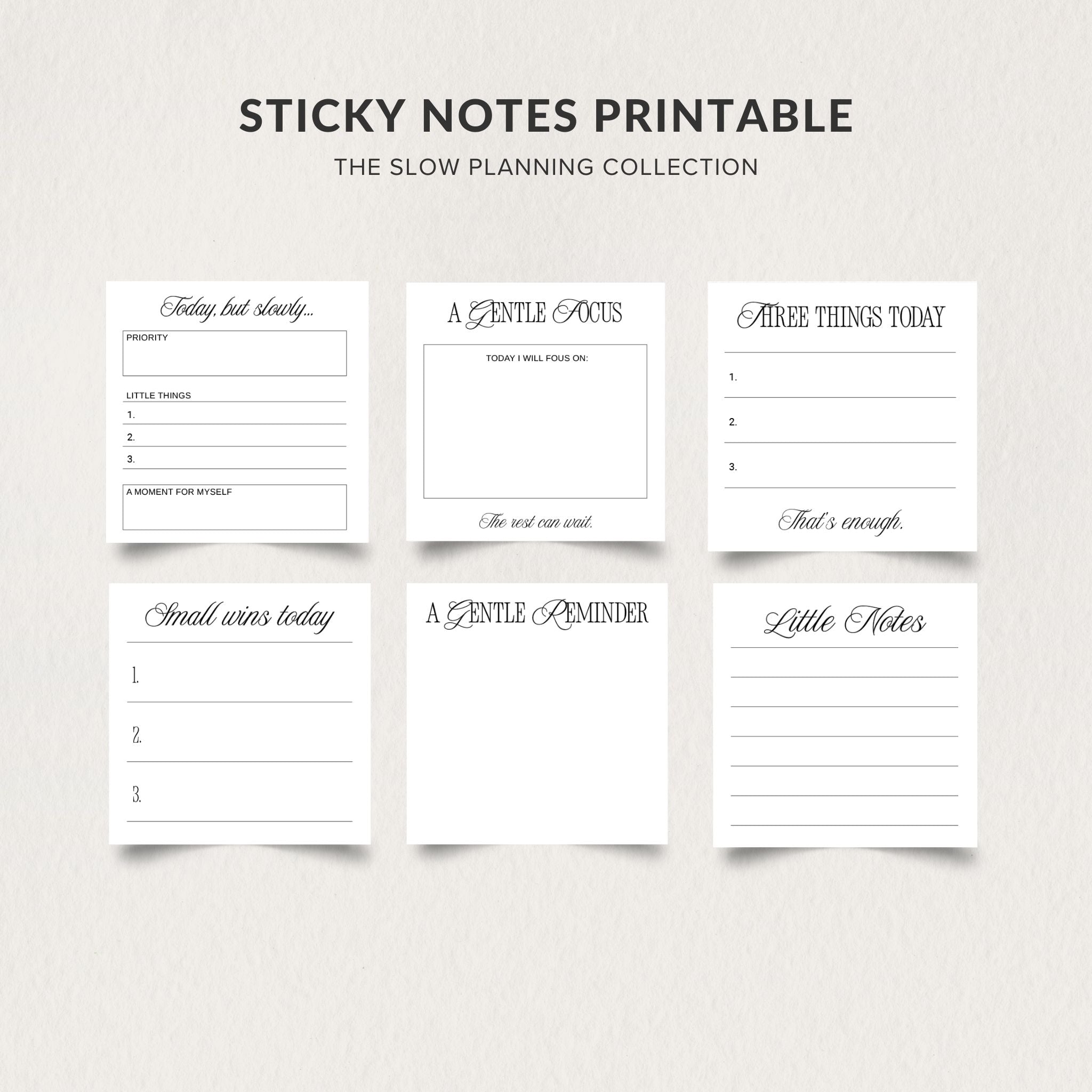 A calm collection of printable sticky notes designed for gentle, intentional planning.