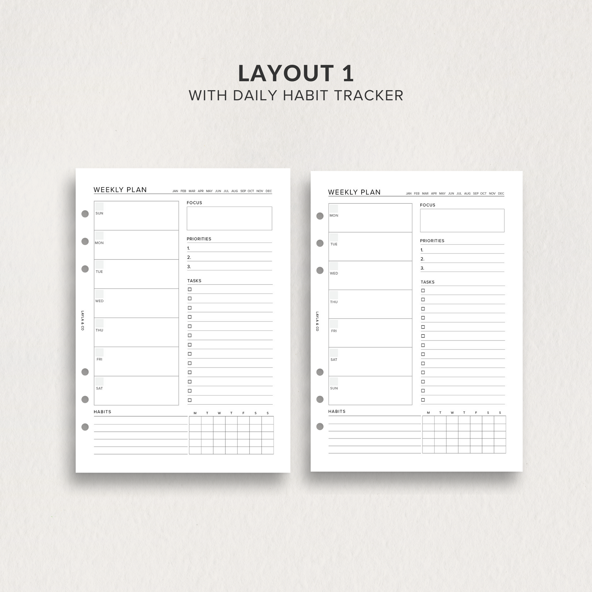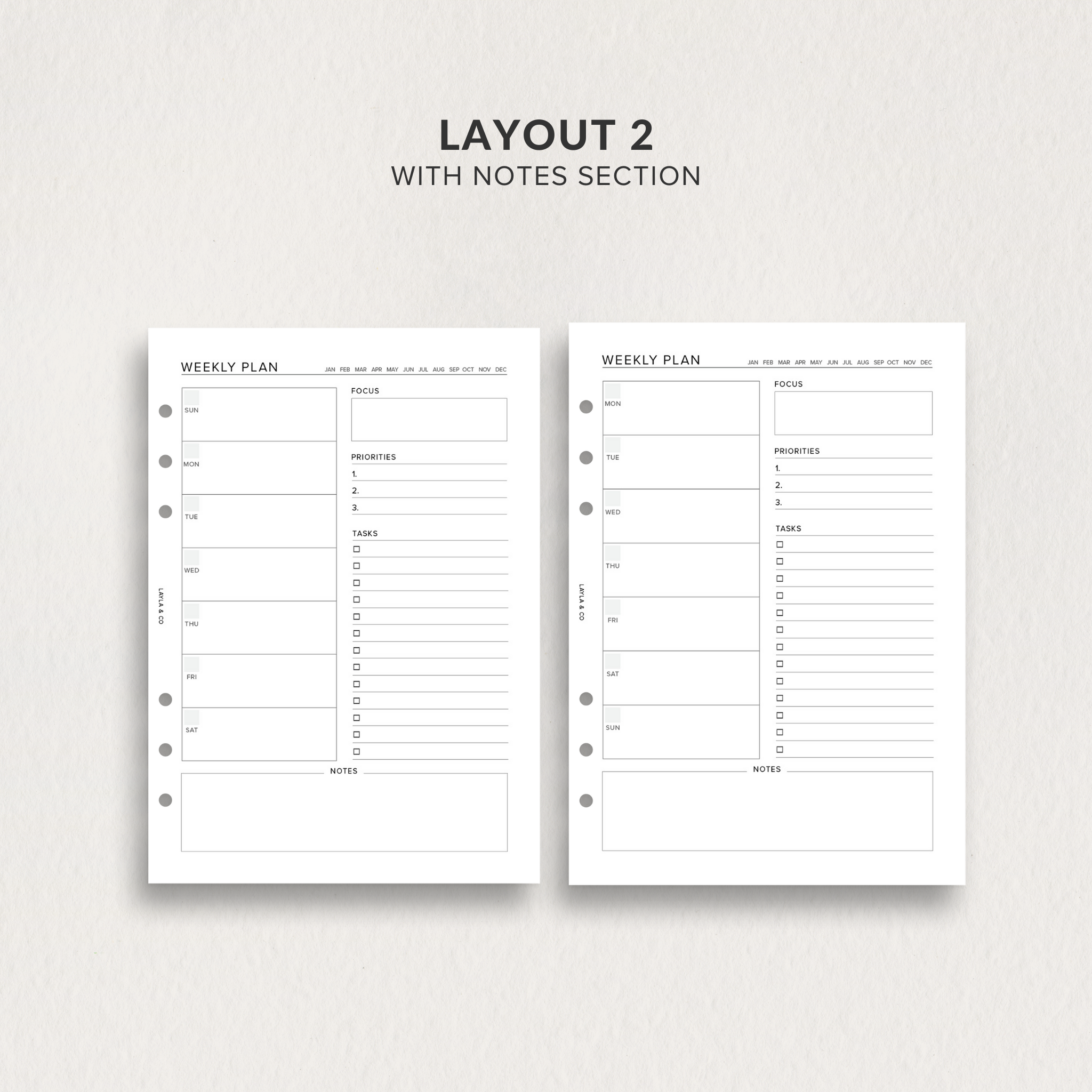 Included are two thoughtfully designed weekly layouts, each available in Monday and Sunday start options, so you can choose the rhythm that fits your life best.